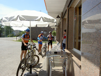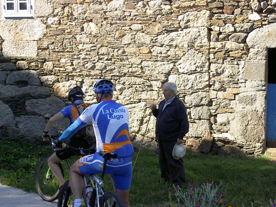 Hemos topado con muy buenas gentes como estas de la foto inferior que nos dieron agua y nos ofrecían lo que hiciera falta; ¡claro! sólo tuvimos que decir que conocíamos a Santiso, que había sido él el que nos animó a hacer esta ruta y nosotros, sin conocerla, nos estaba matando de lo durísima que nos resultaba y tantos kilómetros como faltaban para llegar a Lugo ... a poco más nos preparan mesa y mantel en esta inmejorable compañía.